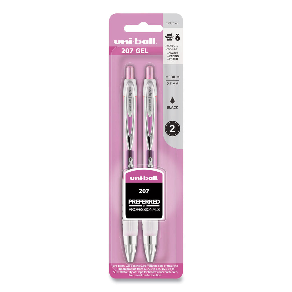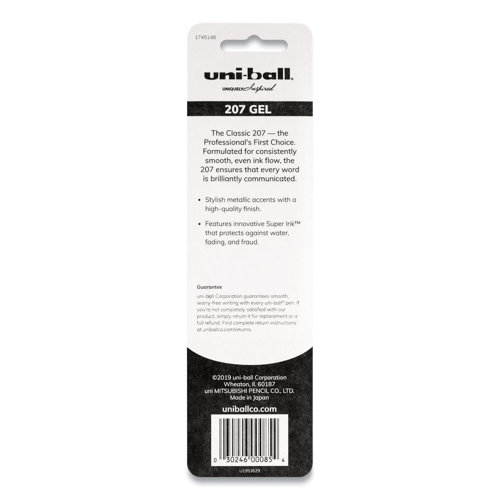 Stock your office, home or classroom with 207 Retractable Gel Pens from uni-ball available in various point sizes with a stainless steel tip that resists bending and breaking. Even-flowing, pigment-based gel ink delivers a smooth writing experience for intense, vibrant lines, ensuring that every mark is brilliantly communicated. Use these retractable gel pens for everyday writing tasks, check signing and all of your important signatures, trusting its quick-drying uni Super Ink. Innovative uni Super Ink technology effectively entraps the gel ink into the paper, producing fraud, fade and water-resistant documents that resist check washing or bleaching. A textured grip offers greater comfort and control as you continue writing, while a translucent ink window indicates the level of gel ink remaining, so you don't run out unexpectedly. The sleek design of the 207 with modern metal accents gives the retractable gel pen a stylish touch.