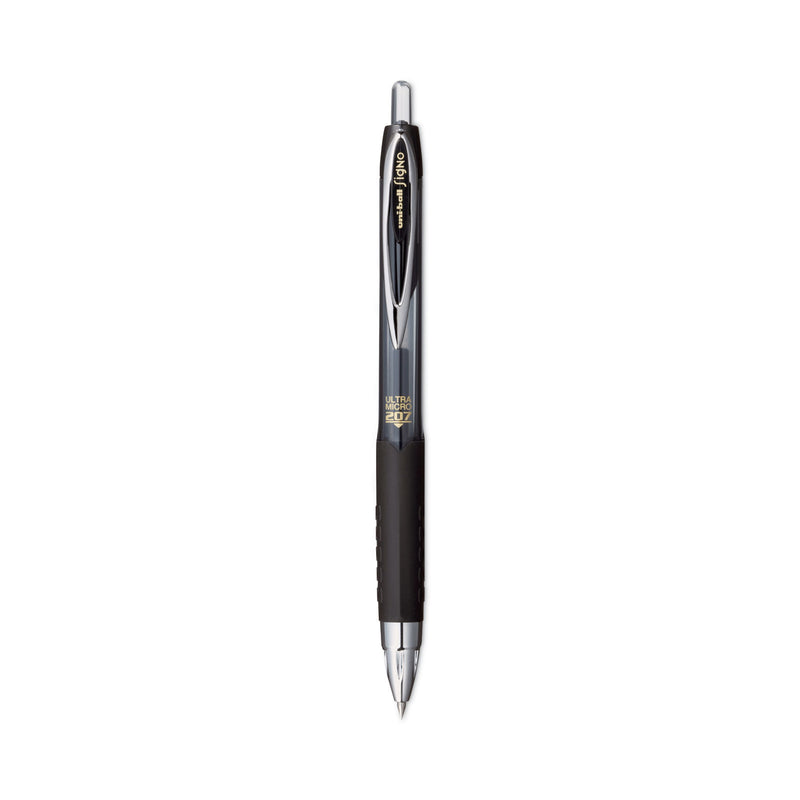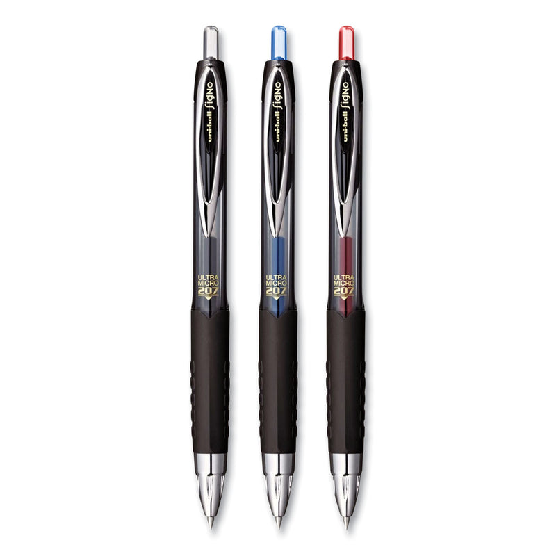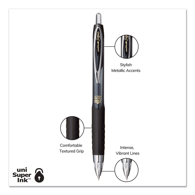 Stock your office, home or classroom with 207 Retractable Gel Pens from uni-ball featuring a 0.38 mm ultra micro point with a stainless steel tip that resists bending and breaking. Even-flowing, pigment-based gel ink delivers a smooth writing experience for intense, vibrant lines, ensuring that every mark is brilliantly communicated. Use these retractable gel pens for everyday writing tasks, check signing and all of your important signatures, trusting its quick-drying uni Super Ink. Innovative uni Super Ink technology effectively entraps the gel ink into the paper, producing fraud, fade and water-resistant documents that resist check washing or bleaching. The 0.38 mm ultra micro point produces neat and precise strokes for intricate writing, making it easy to create super fine details in your drawings and diagrams. A textured grip offers greater comfort and control as you continue writing, while a translucent ink window indicates the level of gel ink remaining, so you don't run out unexpectedly. The sleek design of the 207 with modern metal accents gives the retractable gel pen a stylish touch.