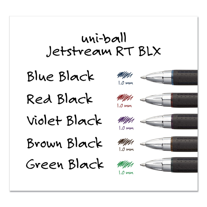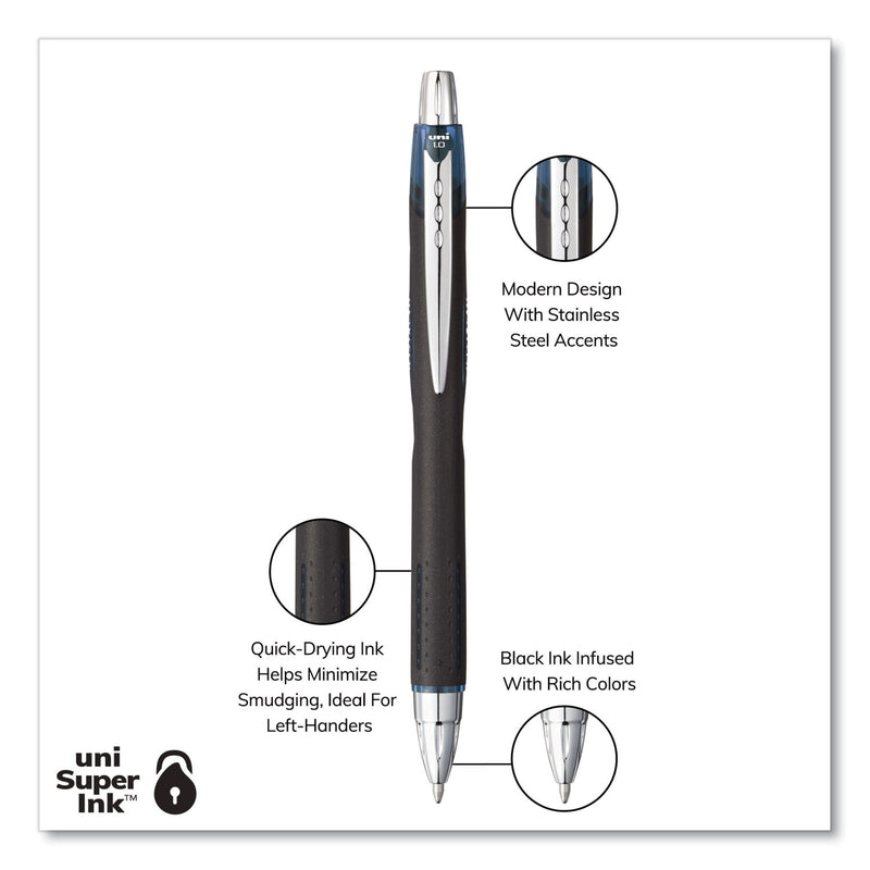 Enjoy your daily writing experience with JETSTREAM RT Retractable Ballpoint Pens from uni-ball. Great pen for everyday writing, these pens contain unique hybrid ink that delivers the smoothness and vibrant color of a gel pen with the quick-drying properties of a traditional ballpoint. JETSTREAM RT pens dry as quickly as you write, which prevents smudging and smearing to produce neat-looking documents. uni Super Ink technology settles ink particles deep into the paper for protection against water, fading and fraud. Contemporary stainless steel accents offer a stylish appeal while the embossed grip helps maintain precision and control.