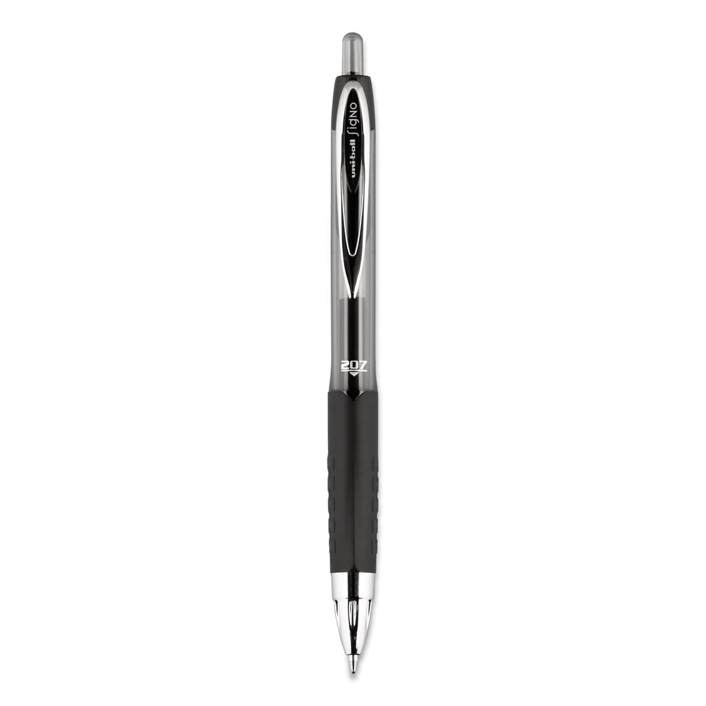 Stock your office, home or classroom with 207 Retractable Gel Pens from uni-ball available in various point sizes with a stainless steel tip that resists bending and breaking. Even-flowing, pigment-based gel ink delivers a smooth writing experience for intense, vibrant lines, ensuring that every mark is brilliantly communicated. Use these retractable gel pens for everyday writing tasks, check signing and all of your important signatures, trusting its quick-drying uni Super Ink. Innovative uni Super Ink technology effectively entraps the gel ink into the paper, producing fraud, fade and water-resistant documents that resist check washing or bleaching. A textured grip offers greater comfort and control as you continue writing, while a translucent ink window indicates the level of gel ink remaining, so you don't run out unexpectedly. The sleek design of the 207 with modern metal accents gives the retractable gel pen a stylish touch.