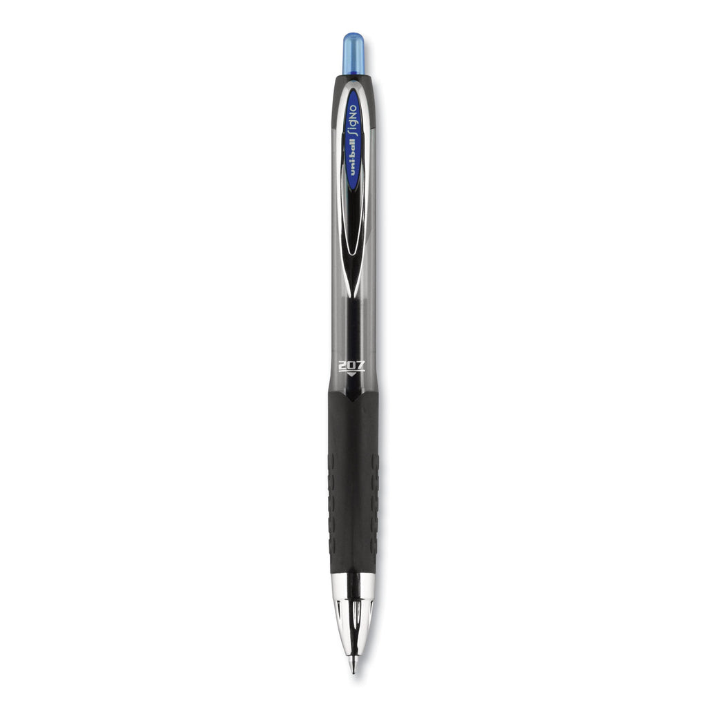 Stock your office, home or classroom with 207 Retractable Gel Pens from uni-ball available in various point sizes with a stainless steel tip that resists bending and breaking. Even-flowing, pigment-based gel ink delivers a smooth writing experience for intense, vibrant lines, ensuring that every mark is brilliantly communicated. Use these retractable gel pens for everyday writing tasks, check signing and all of your important signatures, trusting its quick-drying uni Super Ink. Innovative uni Super Ink technology effectively entraps the gel ink into the paper, producing fraud, fade and water-resistant documents that resist check washing or bleaching. A textured grip offers greater comfort and control as you continue writing, while a translucent ink window indicates the level of gel ink remaining, so you don't run out unexpectedly. The sleek design of the 207 with modern metal accents gives the retractable gel pen a stylish touch.