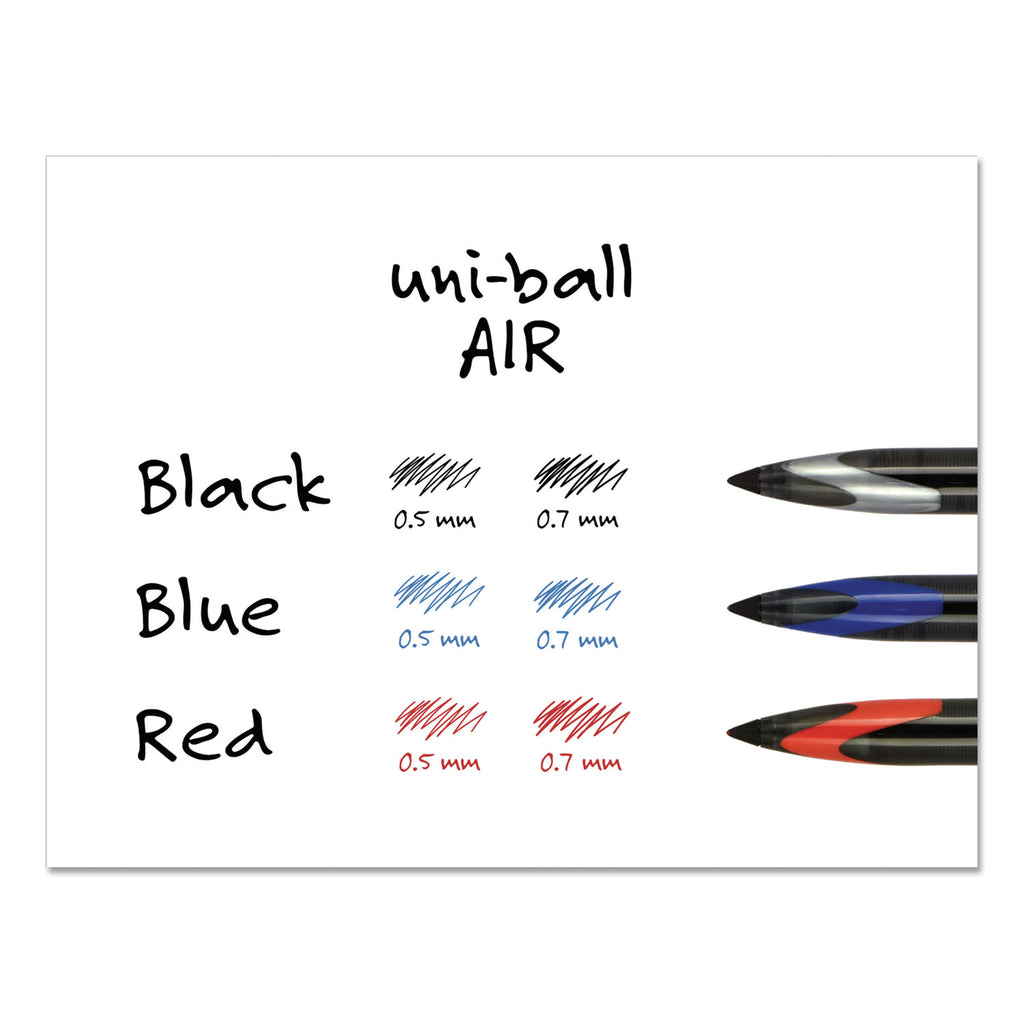 Enjoy a smooth writing experience with AIR Porous Point Rollerball Pens from uni-ball featuring a 0.7 mm medium point. These pens have an innovative sleek tip that writes at any angle while producing crisp, skip-free lines. The porous point rollerball pens adapt to your personal writing grip style, adjusting line widths depending on the pressure of your hand as you write. Combining the fluid ink of a marker with the durability of a rollerball, these pens deliver a smooth writing experience while ensuring your documents are easy to read. Suitable for a variety of writing tasks including journaling, scrapbooking or sketching, these pens glide easily over paper, delivering vibrant marks and lines. uni Super Ink technology ensures the ink adheres strongly to the paper, offering protection from fraud, fading and water. A glass-like plastic clip gives these fine marking pens a stylish look while adding a touch of convenience. Experience effortless writing the moment the pen hits the paper with AIR's versatile cushion tip technology and fluid, free flowing ink.