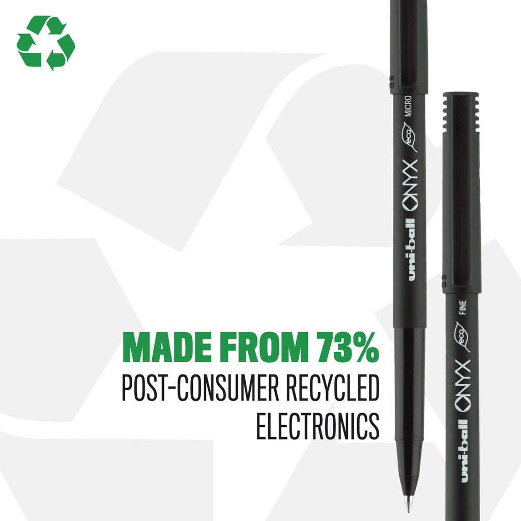 Stock your office, home or classroom with Onyx Rollerball Stick Pens from uni-ball featuring strong, long lasting tip sizes. This rollerball pen delivers the silky-smooth glide of a fountain pen without smudging for effortless writing. ONYX pens produce crisp and precise lines for intricate writing, making it easy to create super fine details in your drawings and diagrams. Capped roller pens are useful for a variety of tasks from note taking to signing checks and legal documents to uniquely embellishing fun and creative writing projects. Innovative uni Super Ink technology forms a strong bond with the paper, protecting from water, fading and fraud. A great economic and environmentally-conscious choice as this super sleek micro point roller pen is made from post-consumer recycled material.