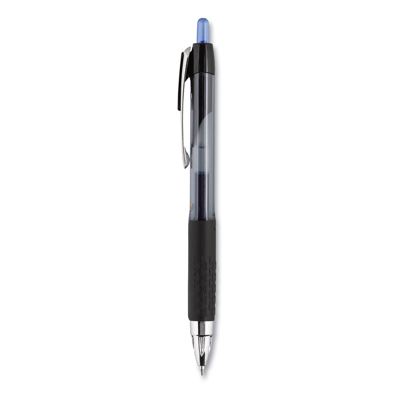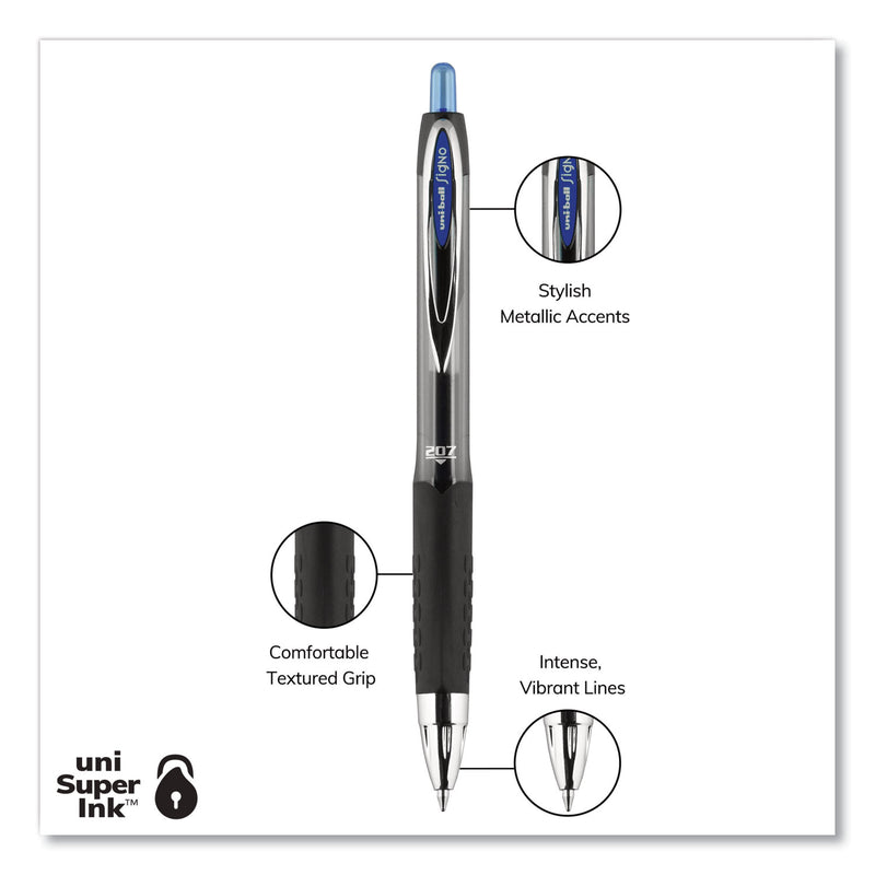 Stock your office, home or classroom with 207 Retractable Gel Pens from uni-ball available in various point sizes with a stainless steel tip that resists bending and breaking. Even-flowing, pigment-based gel ink delivers a smooth writing experience for intense, vibrant lines, ensuring that every mark is brilliantly communicated. Use these retractable gel pens for everyday writing tasks, check signing and all of your important signatures, trusting its quick-drying uni Super Ink. Innovative uni Super Ink technology effectively entraps the gel ink into the paper, producing fraud, fade and water-resistant documents that resist check washing or bleaching. A textured grip offers greater comfort and control as you continue writing, while a translucent ink window indicates the level of gel ink remaining, so you don't run out unexpectedly. The sleek design of the 207 with modern metal accents gives the retractable gel pen a stylish touch.