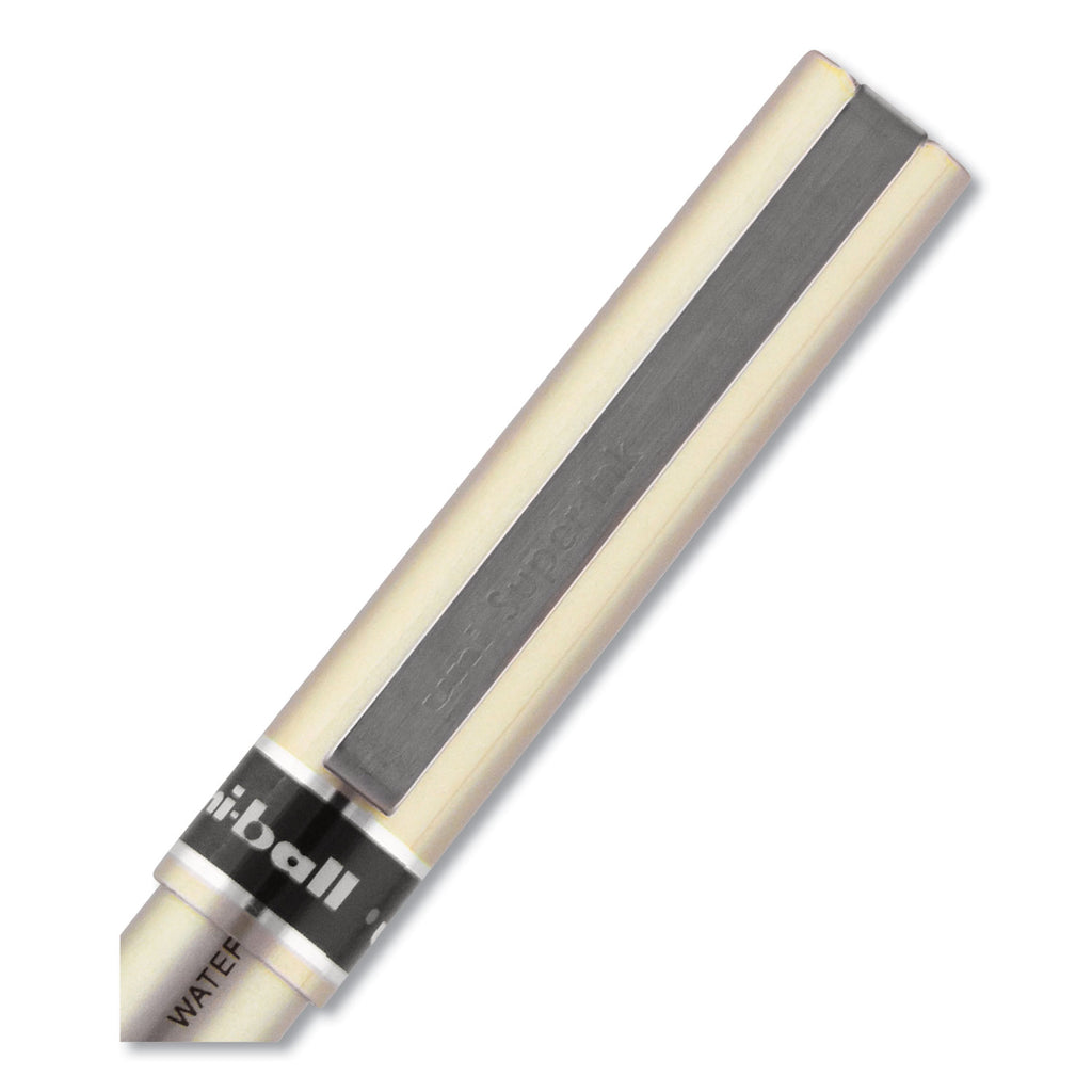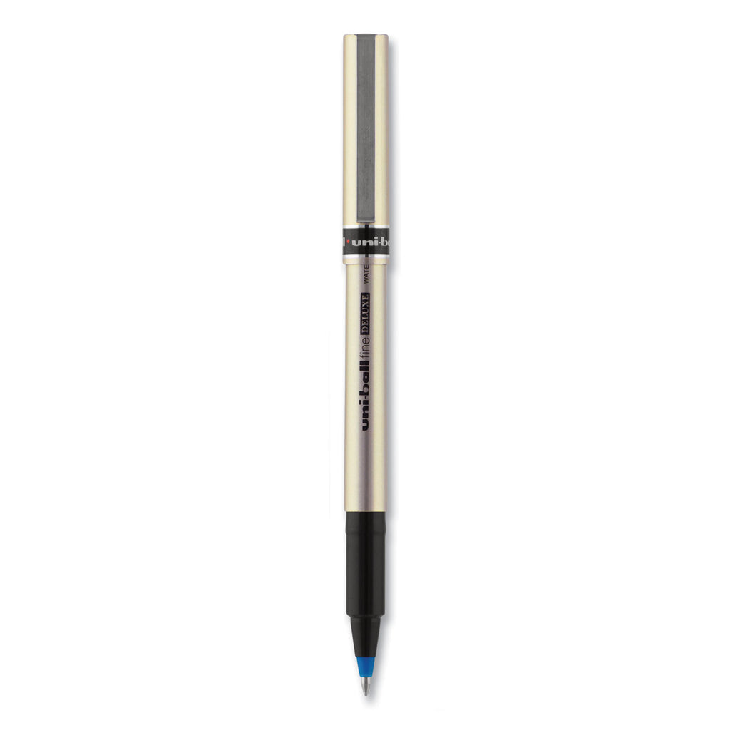 Introduce sophisticated style to your everyday writing with Deluxe Rollerball Stick Pens from uni-ball featuring a strong, long lasting tip. Even-flowing, acid-free liquid ink delivers a smooth writing experience for intense, vibrant lines. Deluxe delivers crisp lines with unparalleled definition, making it easy to create super fine details in your drawings and diagrams. Capped roller pens are useful for a variety of tasks from note taking and list making to signing checks and legal documents. Innovative uni Super Ink technology forms a strong bond with the paper, protecting from water, fading and fraud. Up your writing instrument sophistication with the matte black, brushed steel barrel of the Deluxe capped rollerball pens.