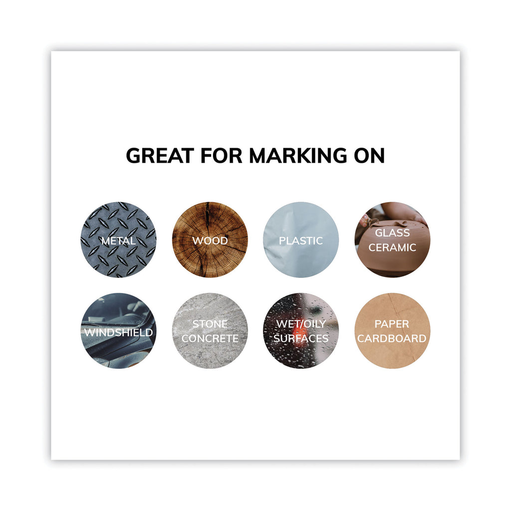 Create permanent and accurate marks on virtually any surface with uni Paint oil-based paint markers from uni-ball. These markers deliver strong and clearly visible lines. Quick-drying paint is water, fade, heat and abrasion resistant. Valve action control provides excellent flow and coverage, while also preventing the marker from drying out if left uncapped. Permanent paint colors mark opaque and glossy on light or dark surfaces, no matter what it is applied to. The metal barrel and durable tip ensures a long marking life. Ideal for manufacturing, construction sites, automotive, metal fabrication, aviation, marking oily, greasy items and identifying parts or equipment outside.