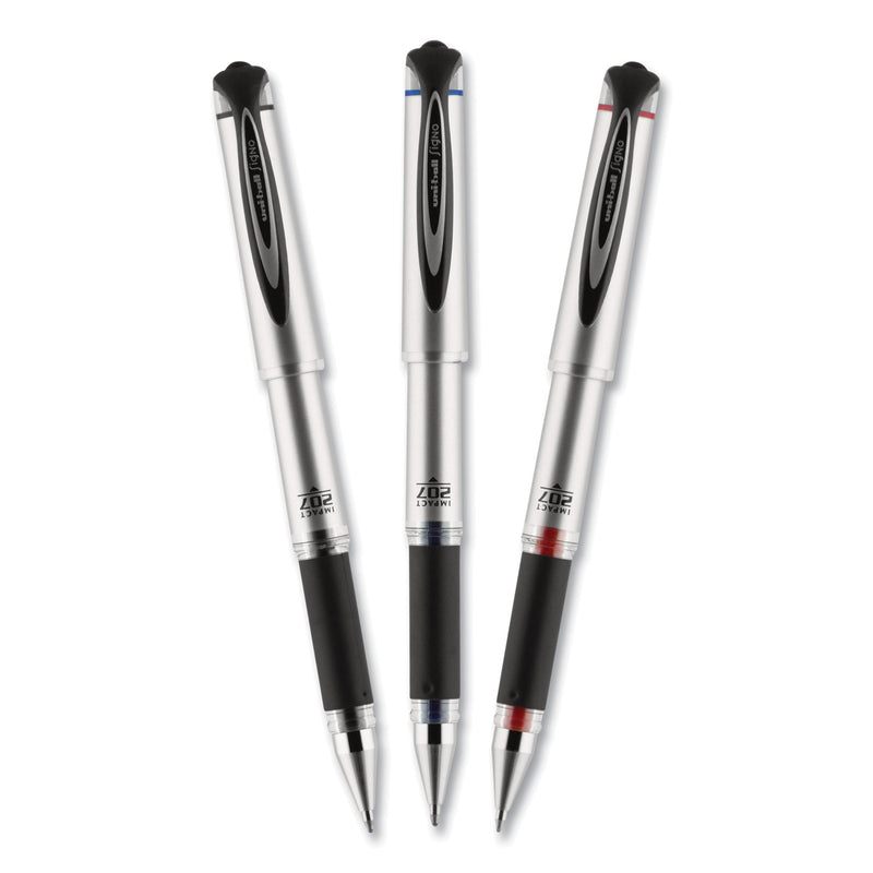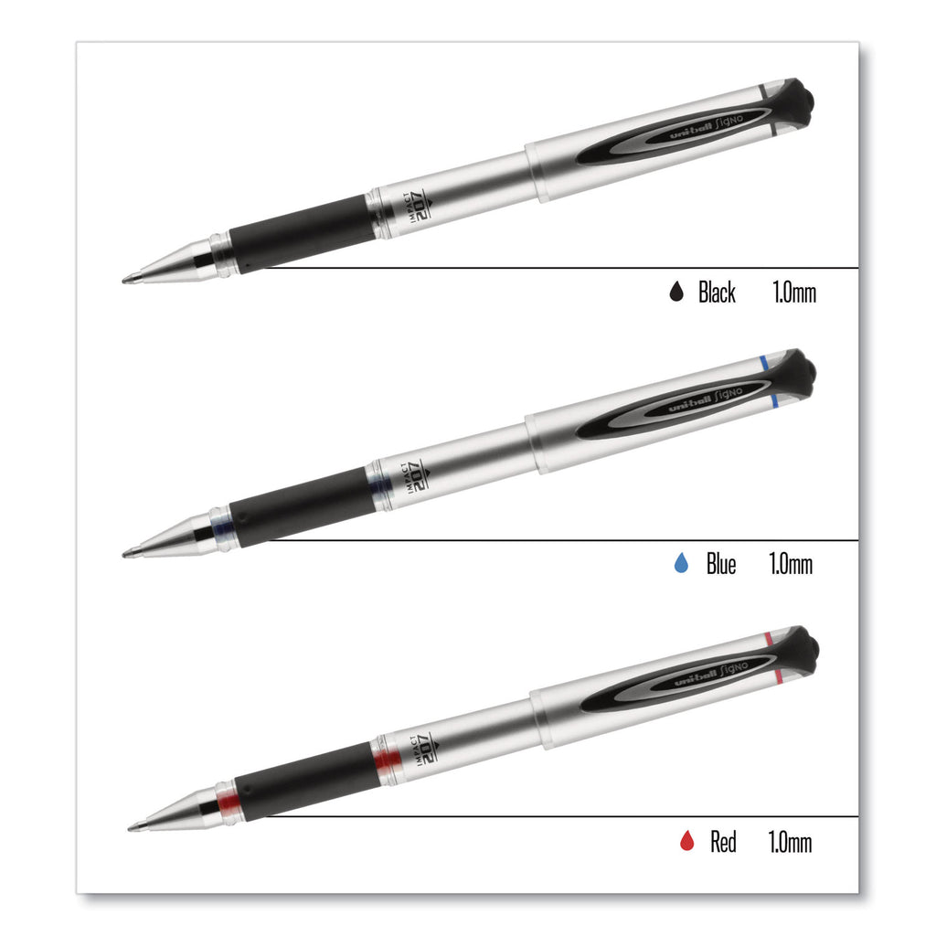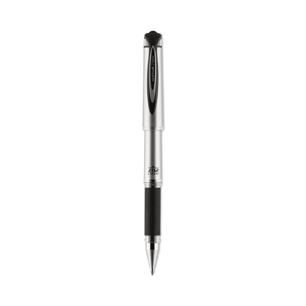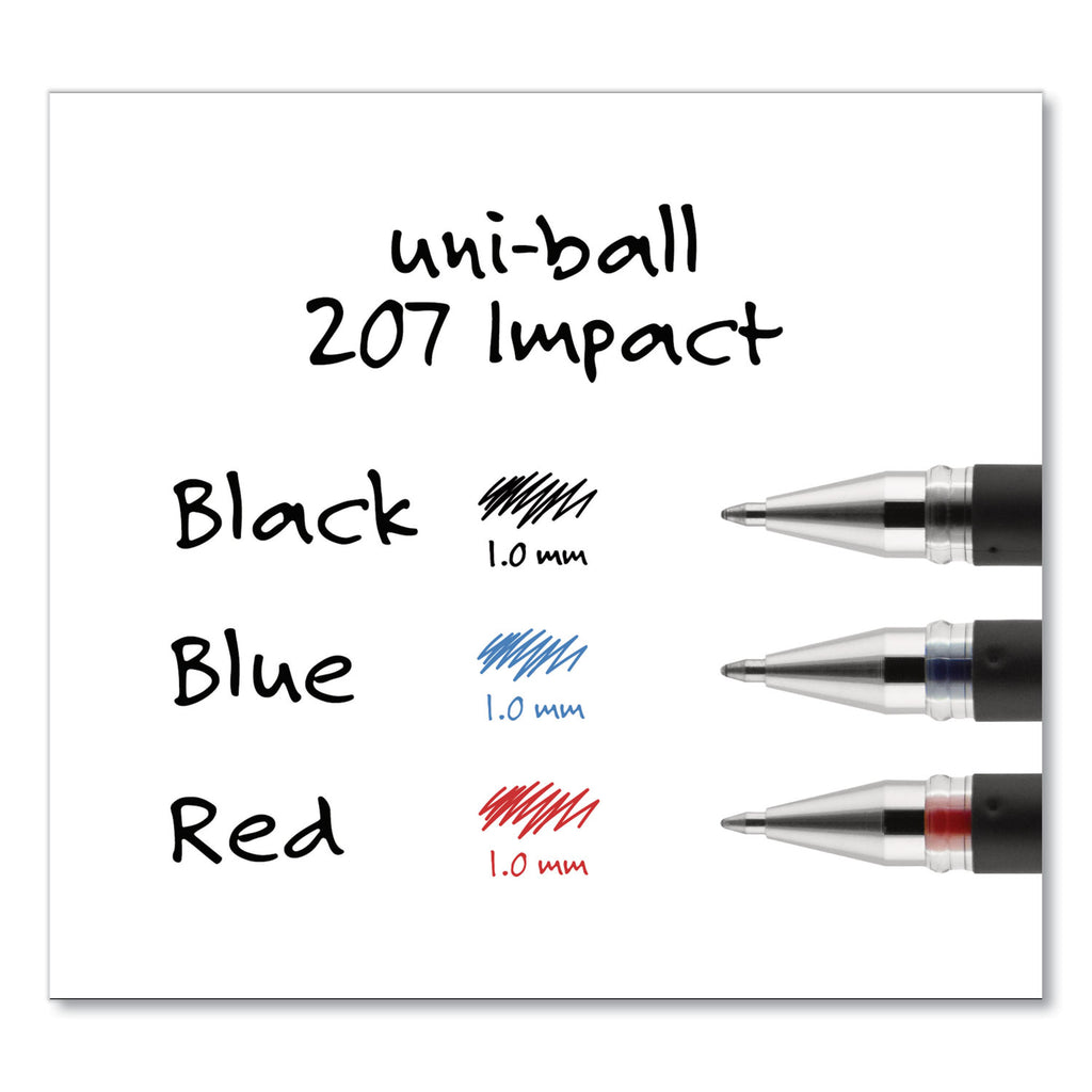 Make an impact with 207 IMPACT Gel Stick Pens from uni-ball featuring a 1.0 mm bold point with a stainless steel tip that resists bending and breaking. Even-flowing, pigment-based gel ink renders an outstanding ink laydown for a smooth writing experience and strikingly bold lines. Use these capped stick gel pens for everyday writing tasks, check signing and all of your important signatures, trusting its quick-drying uni Super Ink. Exclusive uni Super Ink technology entrenches the gel ink deep into the paper, preventing document alteration, water damage or fading. The 1.0 mm point delivers bold writing with a silky finish. A soft rubber grip helps you continue writing without fatigue while maintaining precision and detail throughout your tasks. Lend a vivid touch to your writing with these sophisticated gel stick pens that glide smoothly for distinct and neat writing.