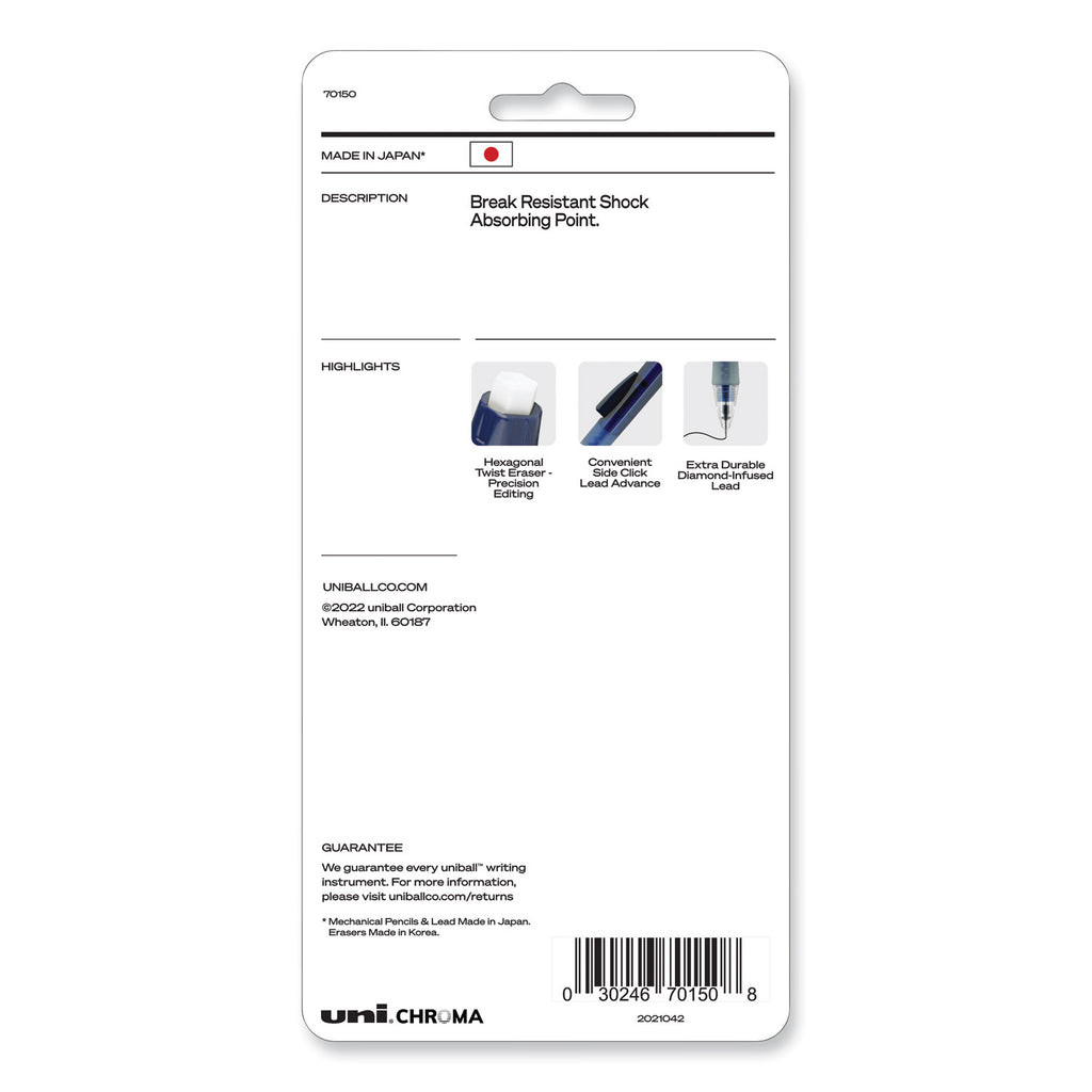 Draw, write, sketch or illustrate with CHROMA Mechanical Pencils from uni-ball. These 0.7 mm HB #2 mechanical pencils feature auto-advancing lead, so you won't experience any interruptions as you write. A shock-absorbing cushioned point reduces lead breakage and facilitates smooth writing. Create vivid text and graphics with 0.7 mm mechanical pencils, which produce striking, dark marks. This side click mechanical pencil comes with a unique hexagonal eraser that has twelve points and edges for optimal editing prevision. Ideal for school work, art projects and note-taking, these refillable pencils have a comfort grip that reduces fatigue while helping you maintain control. CHROMA combines the most popular features requested by mechanical pencil lovers so you can enjoy cutting-edge performance with an endless flow of ideas.