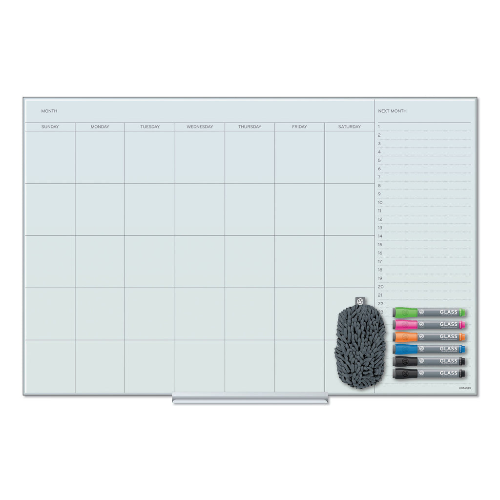 White frosted dry erase calendar board is a perfect and functional solution for the frequent and heavy usage areas of your office, school classroom, home or any commercial space. Clean, contemporary and frameless product design lines will add a touch of subtle style to your wall. The modern frameless feature enables you to hang multiple glass boards adjacent to each other and expand the writing surface to fit your custom space needs. The board's premium ultimate glass writing surface will never stain or ghost. Monthly view enables you to keep track of your hectic schedule. All ink erases easily with a simple eraser and the glass surface continuously outperforms all traditional melamine or painted steel dry erase writing surfaces. Occasionally, use any dry erase board spray or wet dry erase board wipes after continuous use to clean the writing surface. Although all dry erase and glass markers work well with this board, the U Brands dry erase markers provide the ultimate writing and eras-ability experience. For safety, the board is made from tempered glass as well. Modern frameless design includes hidden mounting brackets that give the impression that the board is floating on the wall. Mounting hardware and instructions are included for quick and easy mounting. The board is packaged with extra supportive corrugate material that is highly resistant to damage during shipping; all corrugated material can be recycled once unpacked.
