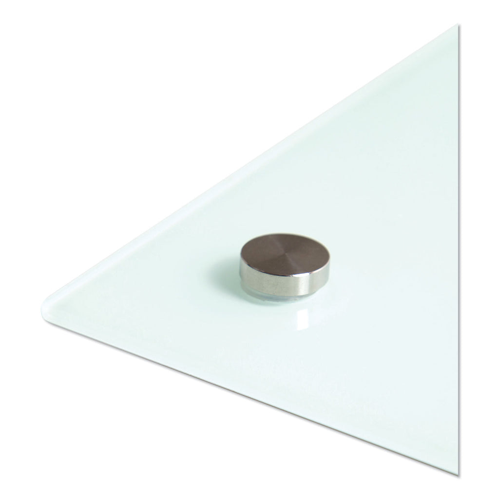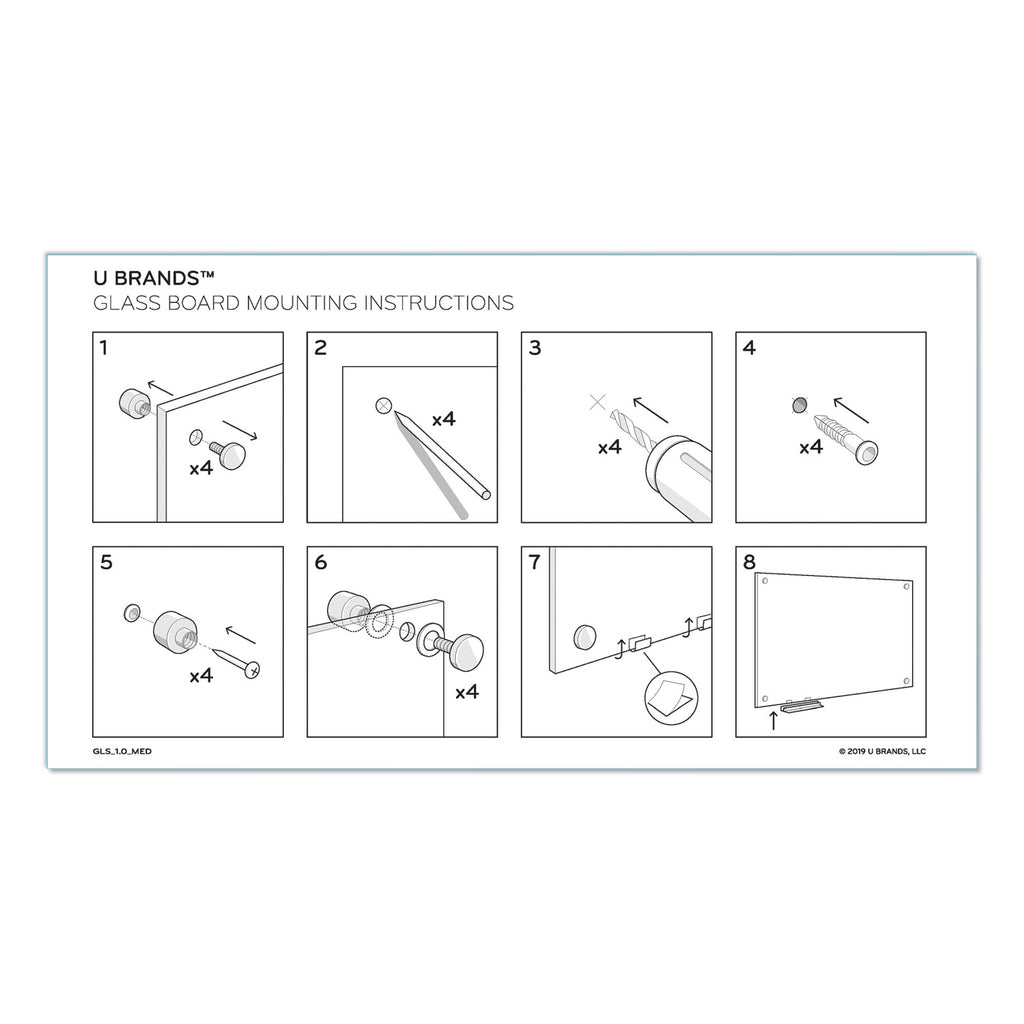 White frosted magnetic glass dry erase board is a perfect and functional solution for the frequent and heavy usage areas of your office, school classroom, home or any commercial space. Clean, contemporary and frameless product design lines will add a touch of subtle style to your wall. The modern frameless feature enables you to hang multiple glass boards adjacent to each other and expand the writing surface to fit your custom space needs. The board's premium magnetic ultimate glass writing surface will never stain or ghost. All ink erases easily with a simple eraser and the glass surface continuously outperforms all traditional melamine or painted steel dry erase writing surfaces. Occasionally, use any dry erase board spray or wet dry erase board wipes after continuous use to clean the writing surface. The glass magnetic surface works with high energy rare earth magnets. Although all dry erase and glass markers work well with this board, the U Brands dry erase markers provide the ultimate writing and eras-ability experience. For safety, the board is made from tempered glass as well. This whiteboard board has a universal mounting system, as it can be hung vertically or horizontally to fit your allocated space. All wall hanging hardware is hidden under the mounting bolts for a sleek and modern appearance. Mounting hardware and instructions are included for quick and easy mounting. The board is packaged with extra supportive corrugate material that is highly resistant to damage during shipping; all corrugated material can be recycled once unpacked.