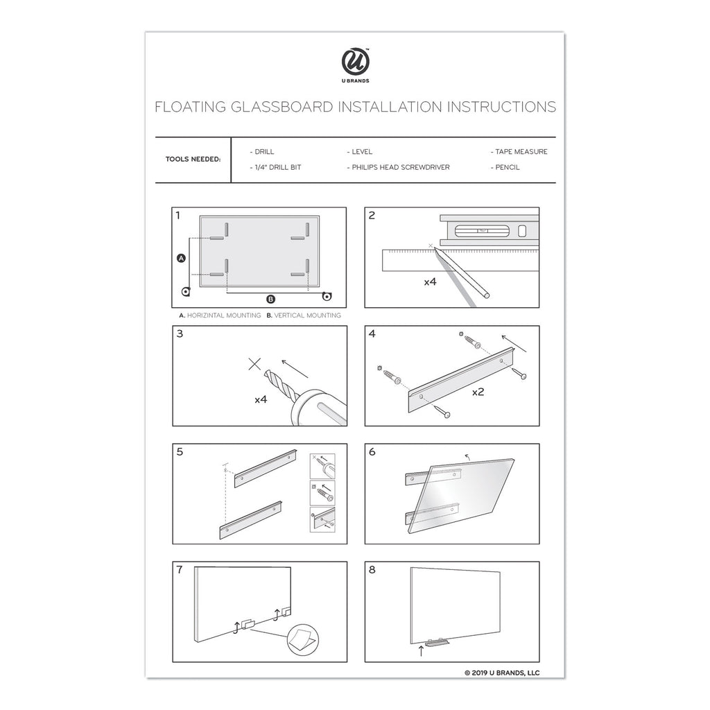 White frosted dry erase calendar board is a perfect and functional solution for the frequent and heavy usage areas of your office, school classroom, home or any commercial space. Clean, contemporary and frameless product design lines will add a touch of subtle style to your wall. The modern frameless feature enables you to hang multiple glass boards adjacent to each other and expand the writing surface to fit your custom space needs. The board's premium ultimate glass writing surface will never stain or ghost. All ink erases easily with a simple eraser and the glass surface continuously outperforms all traditional melamine or painted steel dry erase writing surfaces. Occasionally, use any dry erase board spray or wet dry erase board wipes after continuous use to clean the writing surface. Although all dry erase and glass markers work well with this board, the U Brands dry erase markers provide the ultimate writing and eras-ability experience. For safety, the board is made from tempered glass as well. Includes hidden mounting brackets that give the impression that the board is floating on the wall. All wall hanging hardware is hidden under the mounting bolts for a sleek and modern appearance. Packaged with extra supportive corrugate material that is highly resistant to damage during shipping; all corrugated material can be recycled once unpacked.
