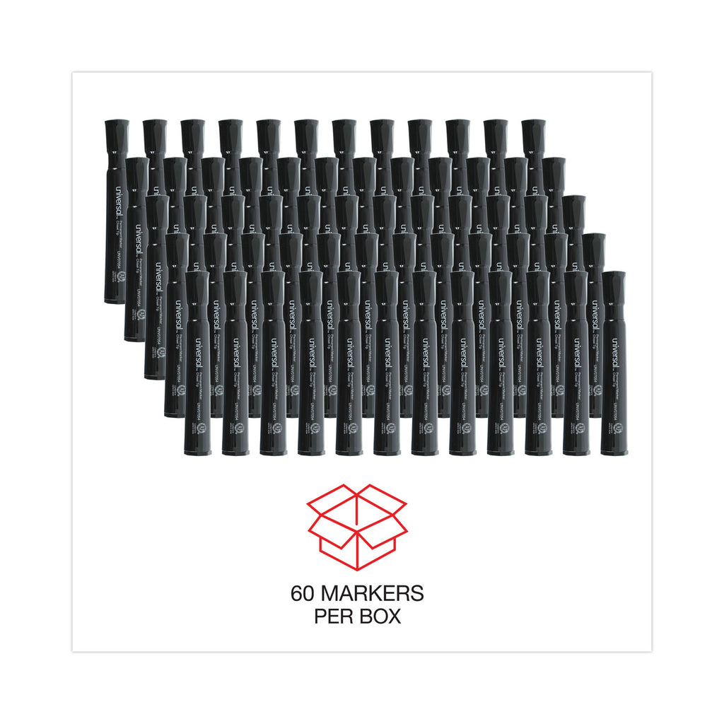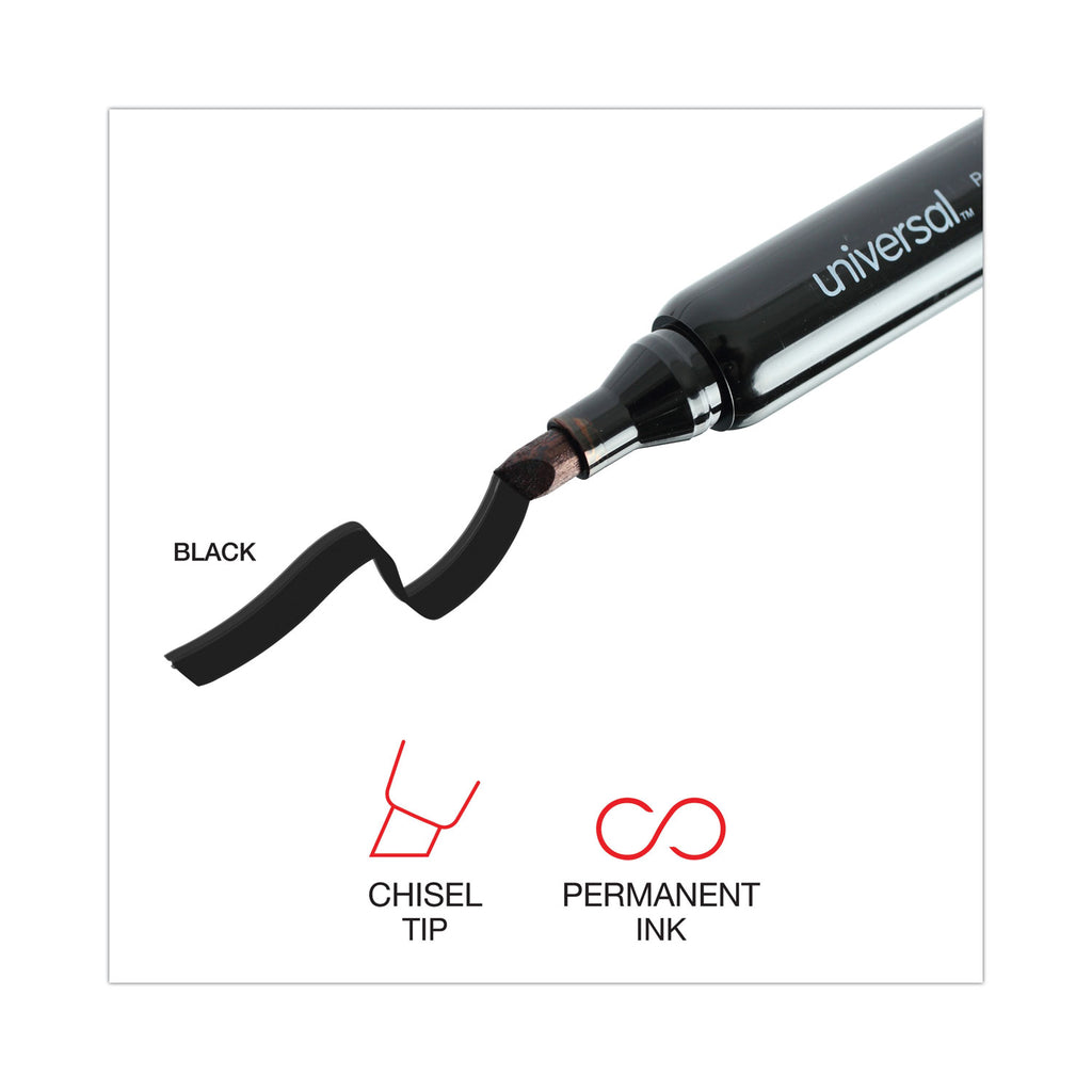 Universal™ Chisel Tip Permanent Marker makes a big impression with vibrant ink that stands out. The broader plastic barrel makes for an easy grip for hands of all sizes. Strong and bold permanent ink will write on almost any surface. Great for projects, labels, organizing, and offices. Low odor and non-toxic. Cap attaches securely over the tip when not in use and fits inside the barrel during use.