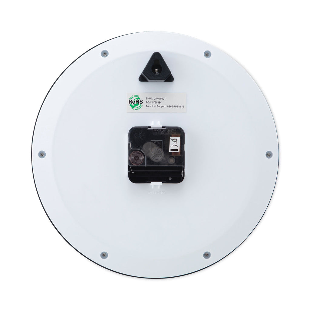 The small-scale dial and diameter clock with larger numbers is ideal for smaller rooms. The modern, compact design fits into tight spaces without sacrificing readability. Features a lightweight design with a bold, black clock frame. Reliable quartz movement with hour, minute, and second hands, ensures accurate timekeeping. A crystal clear, high-quality, flat glass face provides maximum visibility. Uses 1 AA battery (sold separately).
