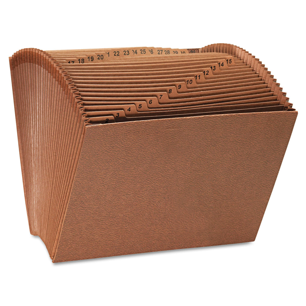 Handsome file can be used as either a desk or shelf organizer. Preprinted dividers help keep your documents in order. Open top design features full-height redrope gussets with Tyvek® reinforcement at the top and bottom for added strength. Each pocket expands to 7/8".
