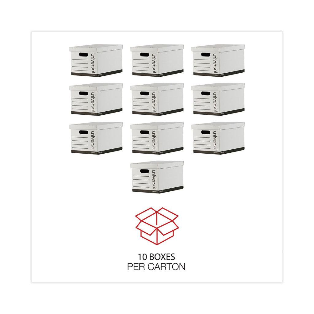 Medium-duty, standard set-up boxes that are great for storage of letter or legal files. Ideal for stacking and storage on shelves. Lift-off lid allows for semi-active use to add and remove files as needed. Equipped with two built-in side handles for easy transport and storage. The easy assembly boxes can be put together without packaging tape. Collapsible and reusable. Made of corrugated cardboard with 350-pound stacking strength. Constructed of double-walled bottom and ends.