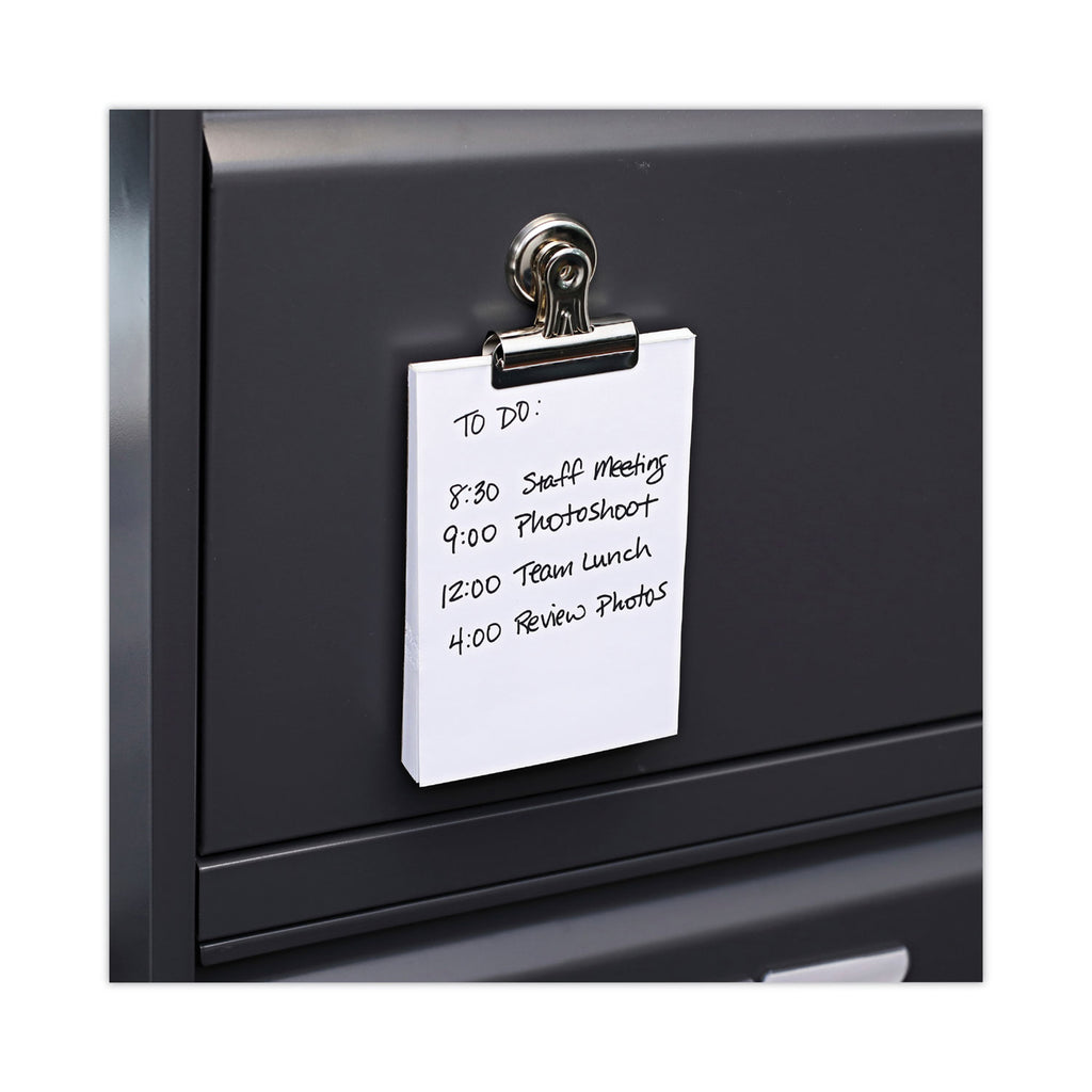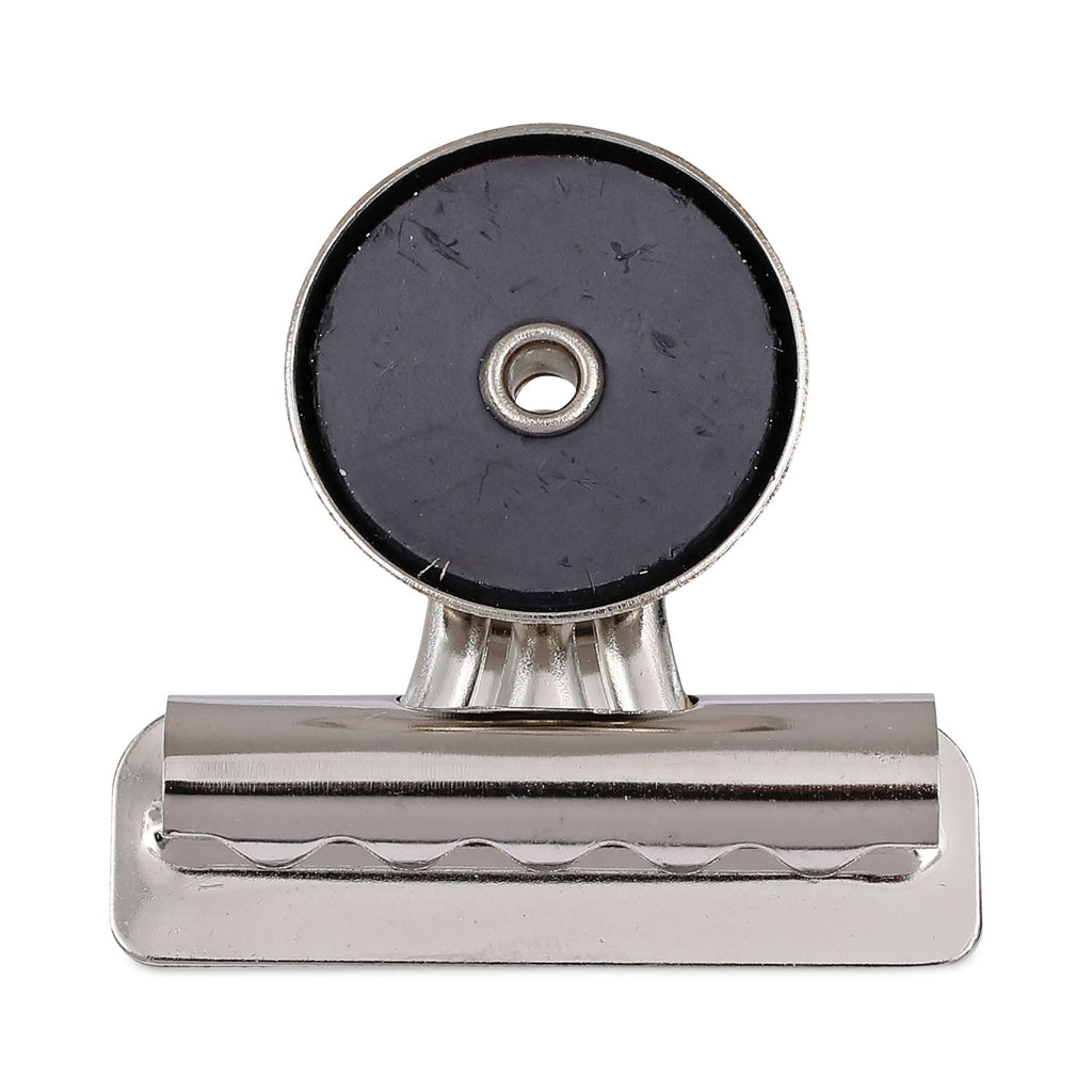 Durable, nickel-plated, magnetic clip is great for hanging notes, calendars, schedules, receipts, or photos on fridges, file cabinets, and other metal surfaces. The strong clip is built with heavy-duty construction for long-lasting, reliable use. The round, magnetic backing stays in place without sliding, even when holding multiple papers. Reinforced clip with added strength for gripping single or multiple sheets of paper with ease.