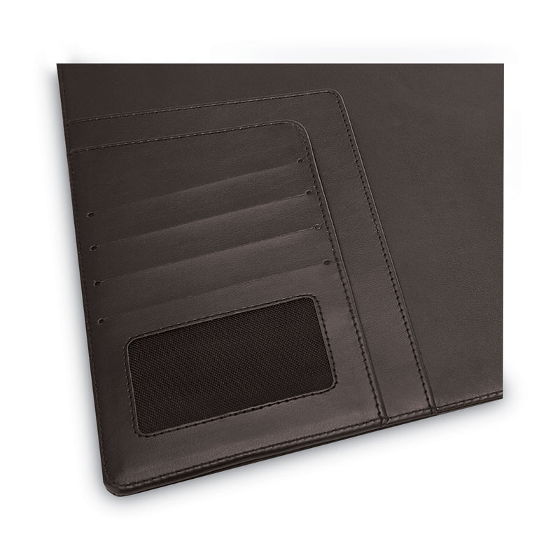 Stylish, soft padded leather-feel padfolio. Elastic enclosure keeps everything together. Accommodates standard size letter pads. Features two pockets, business card pocket, see-through I.D. holder and a writing pad.