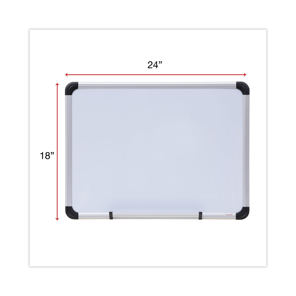 Stylish and functional dry erase board that also doubles as magnetic bulletin board. Built with a magnetic lacquered-steel surface that is suitable for frequent use and is compatible with all dry-erase markers. Modern, contoured aluminum frame features attractive, protective, black, rounded, plastic corners. Four-corner system enables vertical and horizontal mounting with included hardware. Dry erase markers and eraser sold separately.
