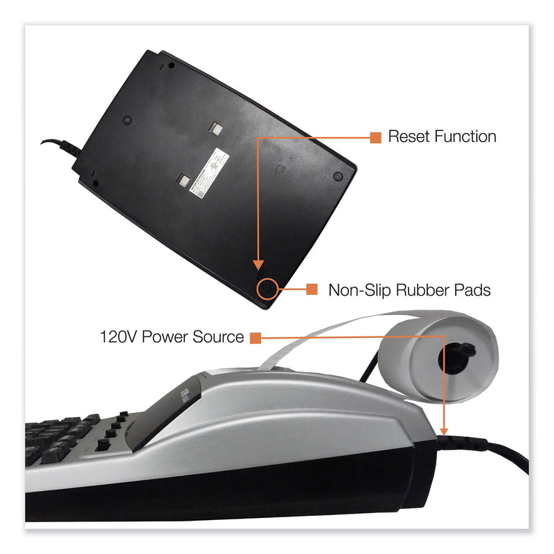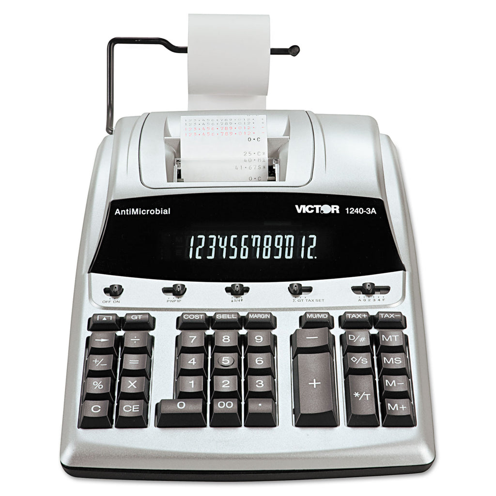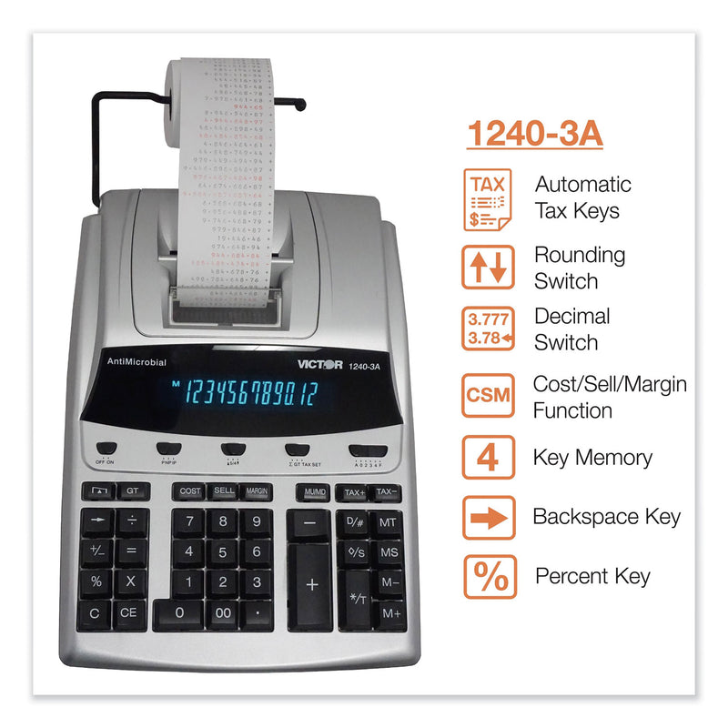 Victor® 12-digit heavy duty commercial printing calculator. Features a contemporary silver and black styling. Engineered with an antimicrobial agent to reduce the growth of microbes and bacteria on the product that can cause discoloration and odors. Manufactured with recycled plastic. Large fluorescent display. Fast 4.3 lines-per-second 2-color printer. Features include: automatic tax keys, markup/gross profit margin, grand total, delta percent, item count, and backspace key.