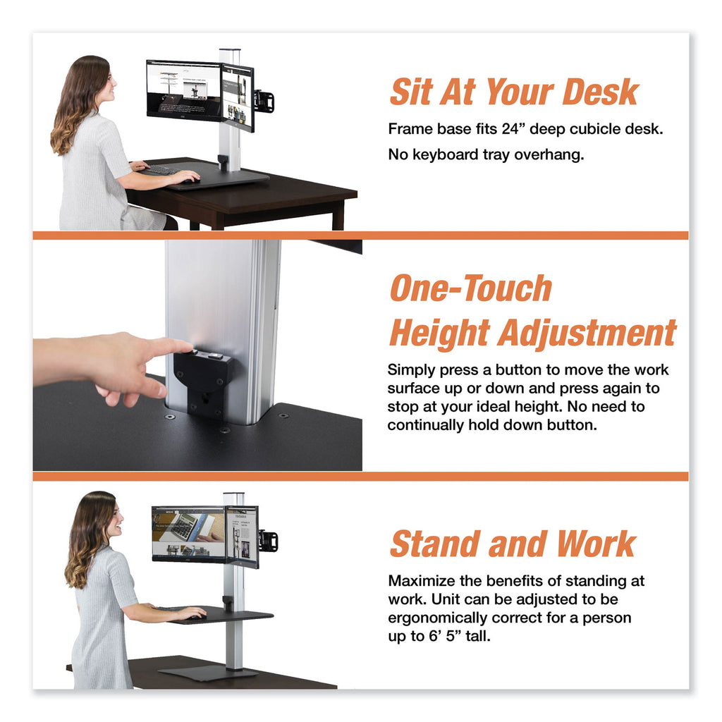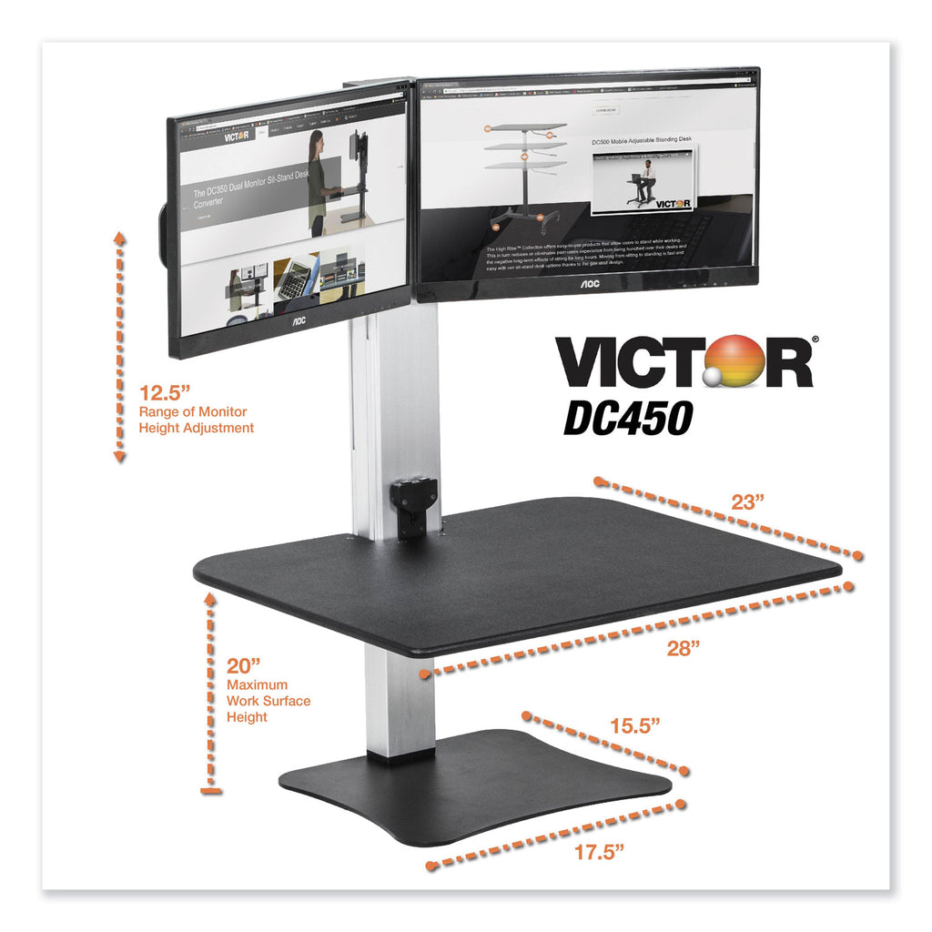 The Victor DC450 transforms any sit-down desk into a sitting or stand-up desk. The 28" wide by 23" deep surface is raised up to 20" for ergonomic placement of monitor, keyboard, mouse, telephone and papers while standing. Electric motor design allows easy custom height adjustment with the push of a button. The monitor holder is also height-adjustable with a range of 12.5". Need a break from standing? Simply push a button and lower the surface down to desktop level. Safety sensor stops movement when obstacles are detected under the desk. Sleek wood construction and a durable laminate coating provides years of use with a modern style. The sturdy steel base and aluminum tower are built to last. This standing desk converter rests on top of any desk or table. With no attachments to tie you down, the item is easily re-positioned. 28"W x 23"L x 1 to 20.25"H. Holds two monitors up to 27" wide and up to 12.5 lbs each. Standard VESA mounting holes are required.