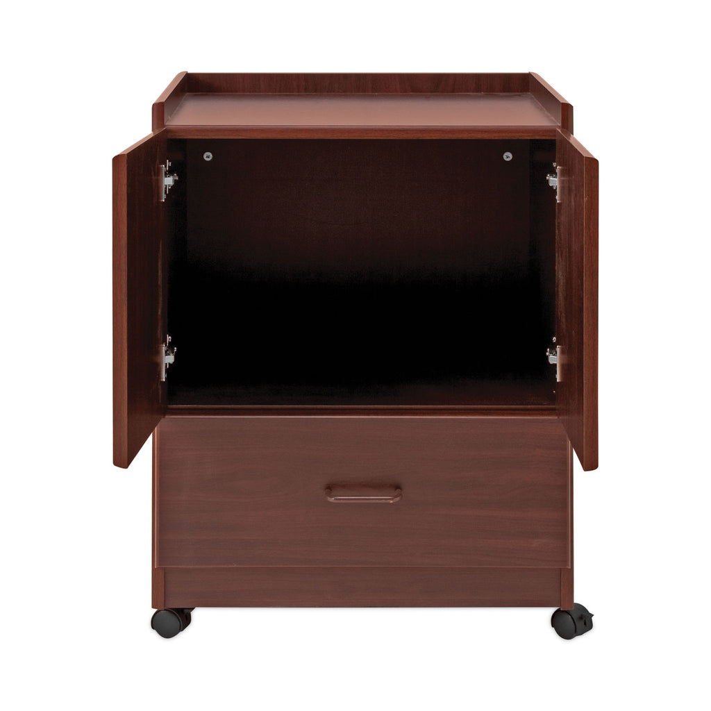 The perfect breakroom addition. Holds different types of small objects, cups, and utensils. Large double door cabinet and bottom drawer provide ample storage space. Raised lip to catch spills. Scratch- and stain-resistant surface helps maintain a clean and new appearance. Set on four casters for easy mobility; two locking. Protective edges help prevent damage. Built to last plastic ensures durability.