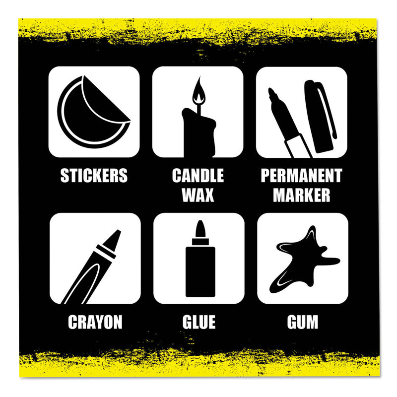- Safely removes adhesives, gum, tar, crayon, scuff marks, wax and sap.