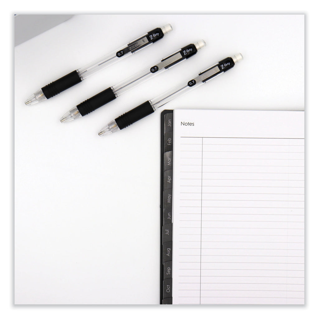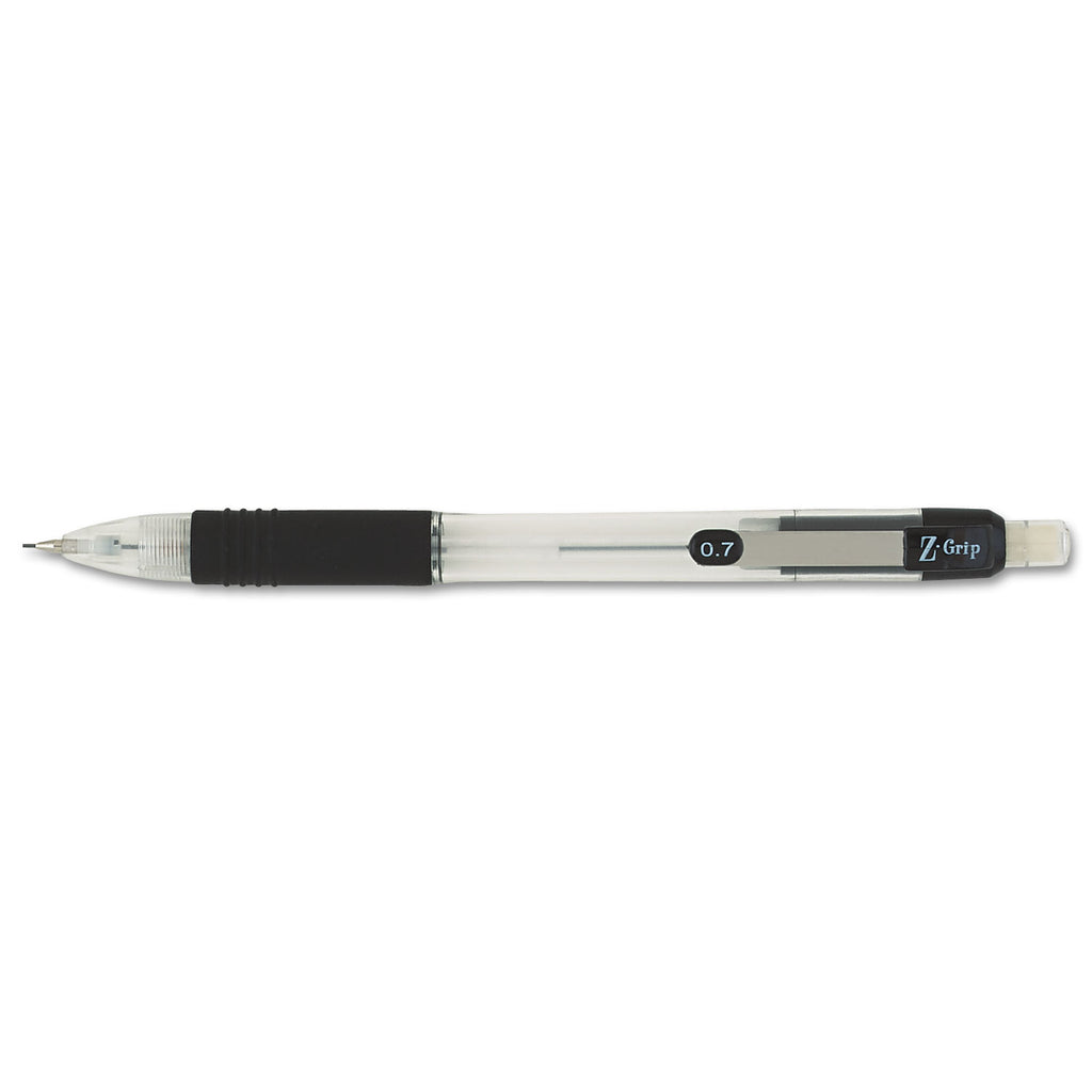 Soft rubber grip cushions fingers for maximum comfort and control. Features a clear barrel so you can monitor your lead and know when you're running low. Retractable sleeve keeps lead safe and reduces breakage, keeping you writing longer. Soft eraser easily handles all of your erasing needs.